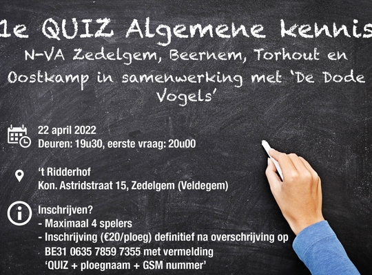 Op vrijdag 22 april vindt de eerste algemene quiz plaats georganiseerd door N-VA afdelingen Torhout, Zedelgem, Beernem en Oostkamp in samenwerking met quizgroep 'De Dode Vogels'!